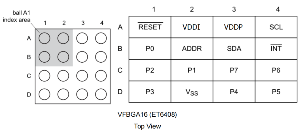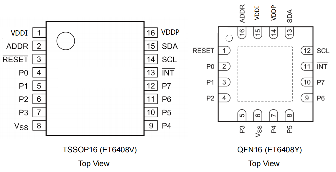 ●封装形式:ET6408 BGA16(1.6mm x 1.6mm)、ET6408V TSSOP16(width 4.4mm )、ET6408Y QFN16 (3mm×3mm)